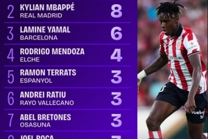 体育资讯8月21日讯 近日,数据机构Squawka统计了西甲联赛首轮突破次数最多的球员榜,尼科-威廉姆斯、姆巴佩和亚马尔是唯一在首轮比赛中完成5次以上过人的球员。