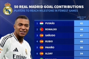 体育资讯8月21日讯 德国转会市场统计了皇马球员参与50粒进球所需的场次,并列出最快参与50球榜单,普斯卡什42场居首,C罗44场次席,姆巴佩60场排名第13位。