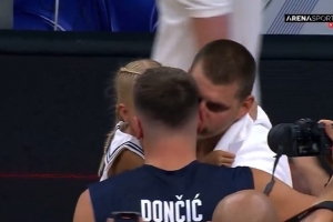赛后约基奇与东契奇亲密互动,前者亲吻了后者的脸颊。