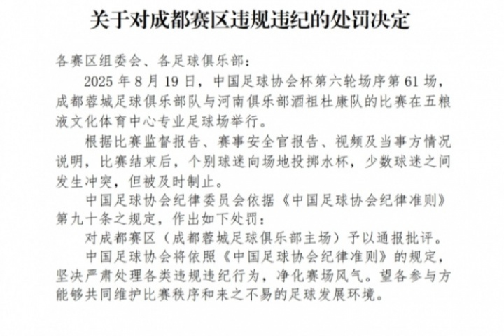 对成都赛区(成都蓉城足球俱乐部主场)予以通报批评。​
