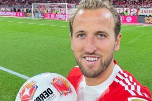 赛后,凯恩与本场比赛用球合影,拜仁在其官方社媒晒出这张照片,并配文写道:“凯恩帽子戏法”。
