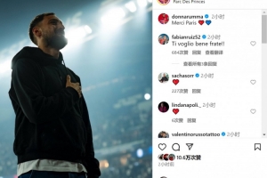 巴黎门将多纳鲁马继续缺席比赛名单,他在赛后向球迷致意,疑似告别。多纳鲁马社媒晒出照片,配文:“感谢巴黎❤️💙”