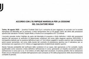 尤文在文件中写道:“俱乐部宣布,已与马赛达成协议,以临时转会的形式将球员维阿的代表权转让至该俱乐部,租期至2026年6月30日,租借费为100万欧元。”