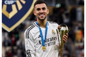 皇马官方社媒晒出塞巴略斯手捧奖杯的照片,配文:“生日快乐,塞巴略斯!”