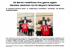 “Epic Sports自豪地宣布,塞内加尔国脚尼古拉斯-杰克逊已加盟拜仁慕尼黑,形式为为期一年的租借,附带强制买断条款,总价为8150万欧元(协议包含5年合同预签)。”