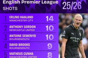体育资讯9月3日讯 数据机构squakwa统计了新赛季英超球员射门情况,哈兰德独自领跑。