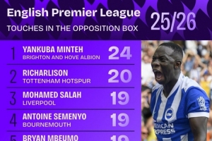 体育资讯9月3日讯 Squawka统计了英超开赛至今球员在对方禁区内触球的次数,并列出榜单,明特24次居首,理查利森20次第二。