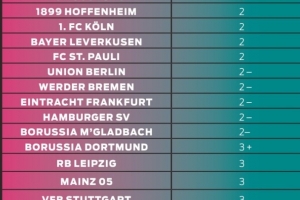 2分:奥格斯堡、霍芬海姆、科隆、勒沃库森、圣保利