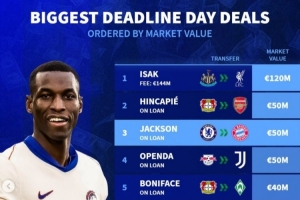 体育资讯9月3日讯 主流联赛夏窗已经关窗,《转会市场》也统计了夏窗截止日转会球员的最贵身价榜情况,伊萨克无悬念领跑。