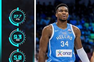 今年欧锦赛至今,字母哥出战3场比赛,效率非常变态,他场均上阵28.7分钟可以砍下27.7分9.7篮板5助攻1抢断,投篮命中率是69.6%,三分命中率为100%(1中1),罚球命中率是62.1%,场均正负值+18,场均效率值为32.3%。