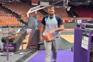东契奇背着包准备离开训练场,他的斯洛文尼亚国家队队友阿伦-欧米奇表示,若东契奇能在通道里投进三分,他就做50个俯卧撑,东契奇投进了。