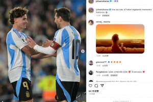 阿尔瓦雷斯在赛后也晒出他和梅西的庆祝照,并配文:“又一次,足球奉上了历史性时刻。”