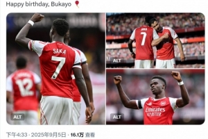 体育资讯9月5日讯 今天是萨卡的24岁生日,阿森纳为他送上祝福。