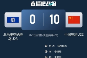 体育资讯9月6日讯 U23亚洲杯预选赛小组赛第2轮,U22国足以10-0的比分击败北马里亚纳群岛U23,下轮将和澳大利亚U23争夺小组头名。