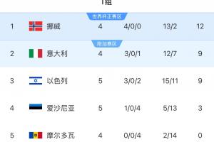 挪威12分仍领跑I组,意大利3连胜升至第二。以色列多赛一场同积9分,暂排第三。