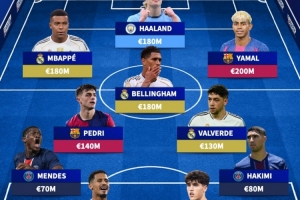 前锋:姆巴佩(1.8亿欧)、哈兰德(1.8亿欧)、亚马尔(2亿欧)