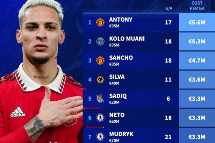 体育资讯08月08日讯 今日德转盘点了参与进球花费转会费最多的球员,其中安东尼以560万欧每球,位列榜首,前十曼联、切尔西各占3席。