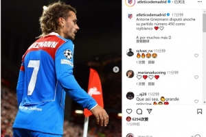 马竞官方晒出格列兹曼的照片,确认此役是他为马竞出战的第450场比赛,格列兹曼为马竞贡献198球93助,随队赢得1次西超杯冠军、1次欧联杯冠军、1次欧超杯冠军。