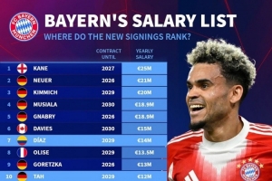 德转列拜仁年薪:凯恩2500万欧居首,迪亚斯1400万、杰克逊600万