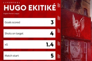 据媒体统计,埃基蒂克英超开局5场比赛皆首发出战,射正4次,预期进球1.4粒,打进3球。