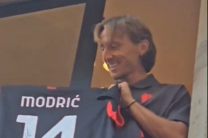 莫德里奇向窗外球迷展示了自己的14号球衣,整条街道都被狂热的米兰球迷所占据,他们齐声高喊着莫德里奇的名字卢卡。