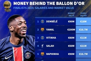 金球奖前10球员年薪:姆巴佩3130万欧最高,登贝莱1800万欧