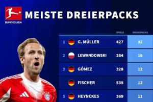 体育资讯09月23日讯 德转统计了德甲历史帽子戏法榜,盖德穆勒32次帽子戏法断层领先,凯恩仅用67场就排在历史第7。