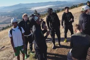 体育资讯9月24日讯 外媒晒出一张俄勒冈大学男篮队员爬山照,中国球员林葳在列,穿上了统一的服装,上脚科比4耐高配色(耐克总部在俄勒冈州,耐克是俄勒冈大学的长期赞助商)。