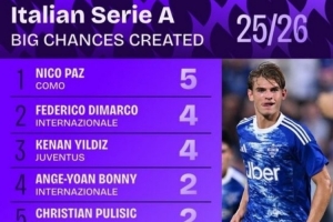 意甲25/26赛季创造重大机会榜:帕斯5次居首,国米三人入选