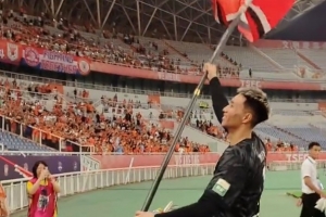 赛后,于金永来到场边,挥舞着旗帜与主场球迷一起互动。