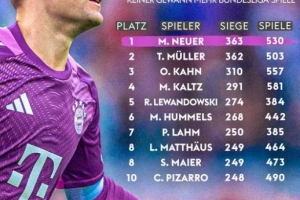 超越穆勒,诺伊尔530场363胜成德甲历史胜场数最多球员