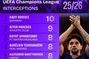 本赛季欧冠拦截榜: