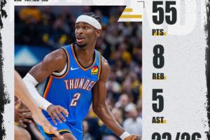 本场比赛,雷霆当家球星亚历山大一展双MVP风采,攻防俱佳,战力十足,末节&加时频频取分,砍下生涯新高的55分&罚球数生涯新高26记,同时成为本赛季全联盟首位50分先生!