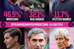 ■以下是Opta超级计算机预测新赛季西甲冠军归属概率: