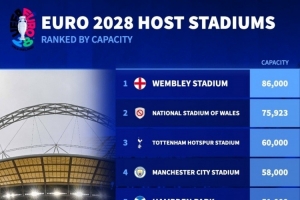 体育资讯11月13日讯 2028年欧洲杯承办球场公布,德国转会市场列出了各球场容量排名。