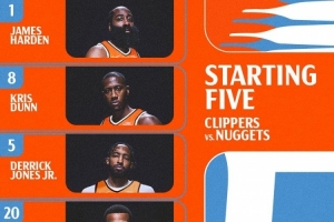 赛前快船公布了本场首发:哈登、邓恩、小德里克·琼斯、科林斯、祖巴茨。