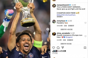 赛后,巴黎队长马尔基尼奥斯更新社媒晒出捧杯欢庆照片,并配文写道:这就是巴黎圣日耳曼,永不放弃坚持战斗到最后!冠军,我的兄弟 😂🏆