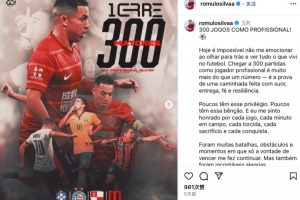 罗慕洛配文写道:“职业生涯出战300场!毫无疑问这很难不让人激动,回首望去,作为职业球员能够完成300次出场,对我而言这不仅仅是数字,更是一段由汗水、奉献、信念与坚韧交织而成的旅途。”