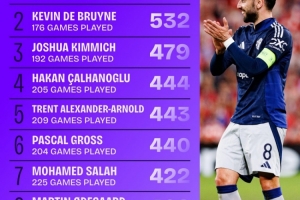 19-20赛季来五大联赛创造机会榜:B费567次居首,萨拉赫422次第7
