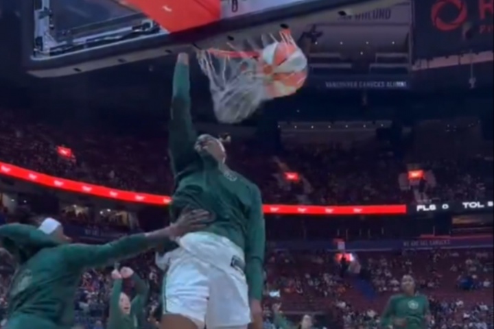 本场比赛赛前训练时,风暴队榜眼秀、法国1米98中锋马隆加轻松起飞完成扣篮。