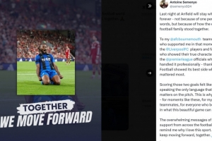 塞梅尼奥写道:昨晚在安菲尔德的经历将永远铭记我心,不是因为某个人的言语,而是因为整个足球大家庭的团结。