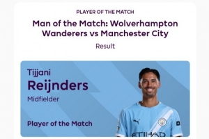 赛后据英超官方消息,曼城中场赖因德斯以52%的得票当选此役全场最佳球员。