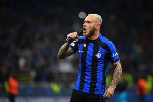 据意大利记者比亚辛透露,迪马尔科因右大腿擦伤被替换下场,而他在上半场为国米首开记录。